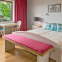 Heller Wohn-Schlafraum, Eichenparkett, weiße Landmöbel. Pinke Vorhänge.